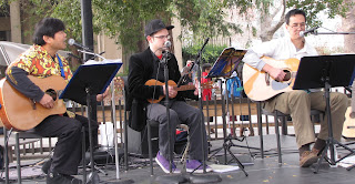 The weather was cloudy and overcast at DeAnza College, Cupertino. Our trio of Hawaiian musicians magically transformed the students and faculty to the Hawaiian islands, where there was the sun, blue sky, the ocean, and Hawaiian hospitality. The leader of this trio, Sil, introduced some of the songs and explained their meaning. Aloha and Mahalo.
